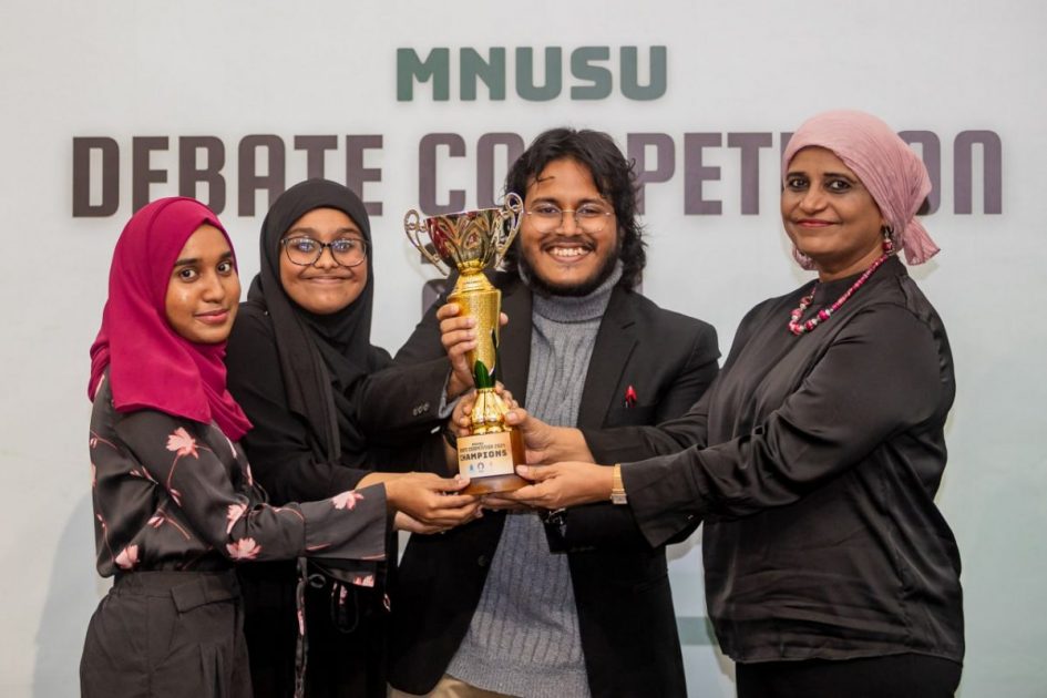 .ދިވެހިރާއްޖޭގެ ޤައުމީ ޔުނިވަރސިޓީ ދަރިވަރުން ޔޫނިއަންގެ ތާރީހުގައި މުޅިން އަލަށް ކުރިއަށްގެންދިޔަ އިނގިރޭސި ބަހުސް މުބާރާތުގެ ފަޙުރުވެރި ޗެމްޕިއަންކަން ފެކަލްޓީ އޮފް އެޑިއުކޭޝަން (އެފް.އީ)ގެ ޓީމުން ހޯދައިފިއެވެ